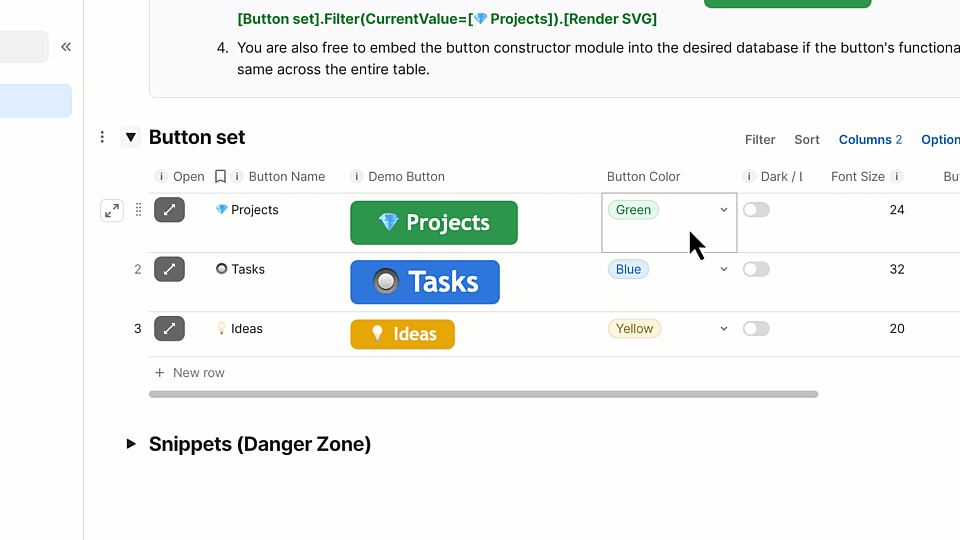Hello @KIRNESH_NANDAN ! As my senior colleague @Christiaan_Huizer mentioned, Coda indeed lacks native settings to control more detailed button design options. However, I can offer you an alternative solution that allows you to control the button’s width, height, and text size for the button name. I’ve attached a doc containing all the instructions. You can copy it to your workspace for detailed exploration. I’ll be happy if this solution proves helpful!
