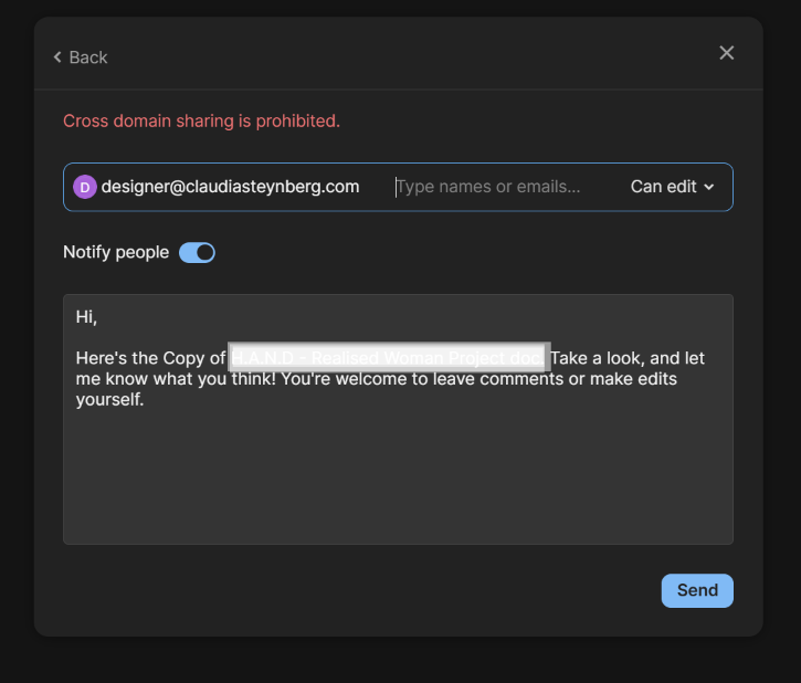 I recently changed my emails as I tested Coda with designer@claudiasteynberg.com then migrated to my business email hello@howaboutnow.design. both are Gmail but weirdly I can share documents from my designer@ email to my hello@ but not the other way around. I get this error: