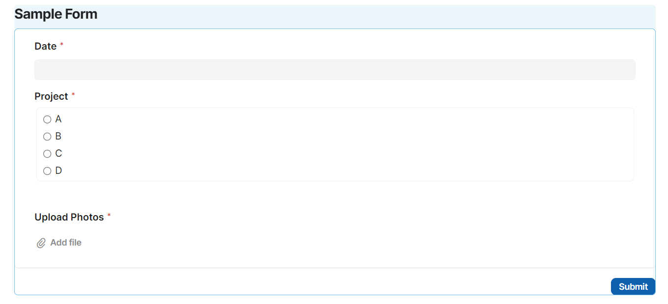 So, I have here a sample form, where it have fields for Date, Project, and upload photos.