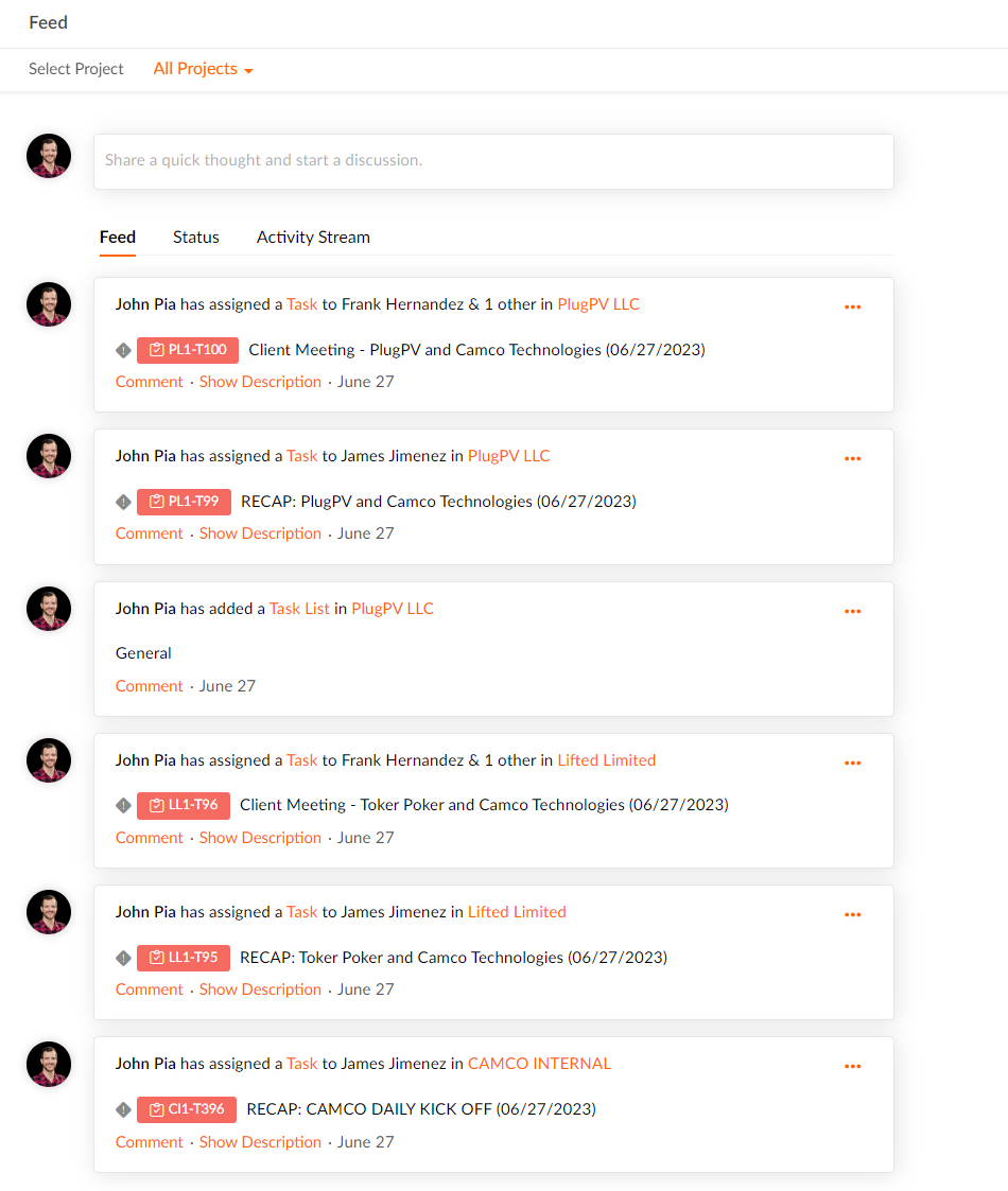 We leverage comments heavily within coda so ideally the feed will include all comments as well as tasks created or really any record action taken by a user.