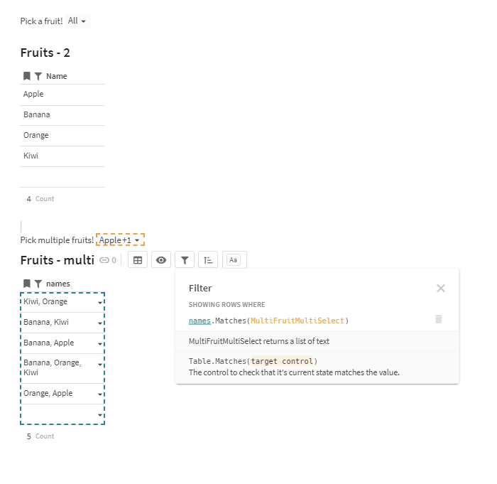 @Ander - what would you want the results to be here say you chose Apple + Banana in the control. Should it show all rows that have Apple or Banana or Apple and Banana Only or Contain Apple and Banana.