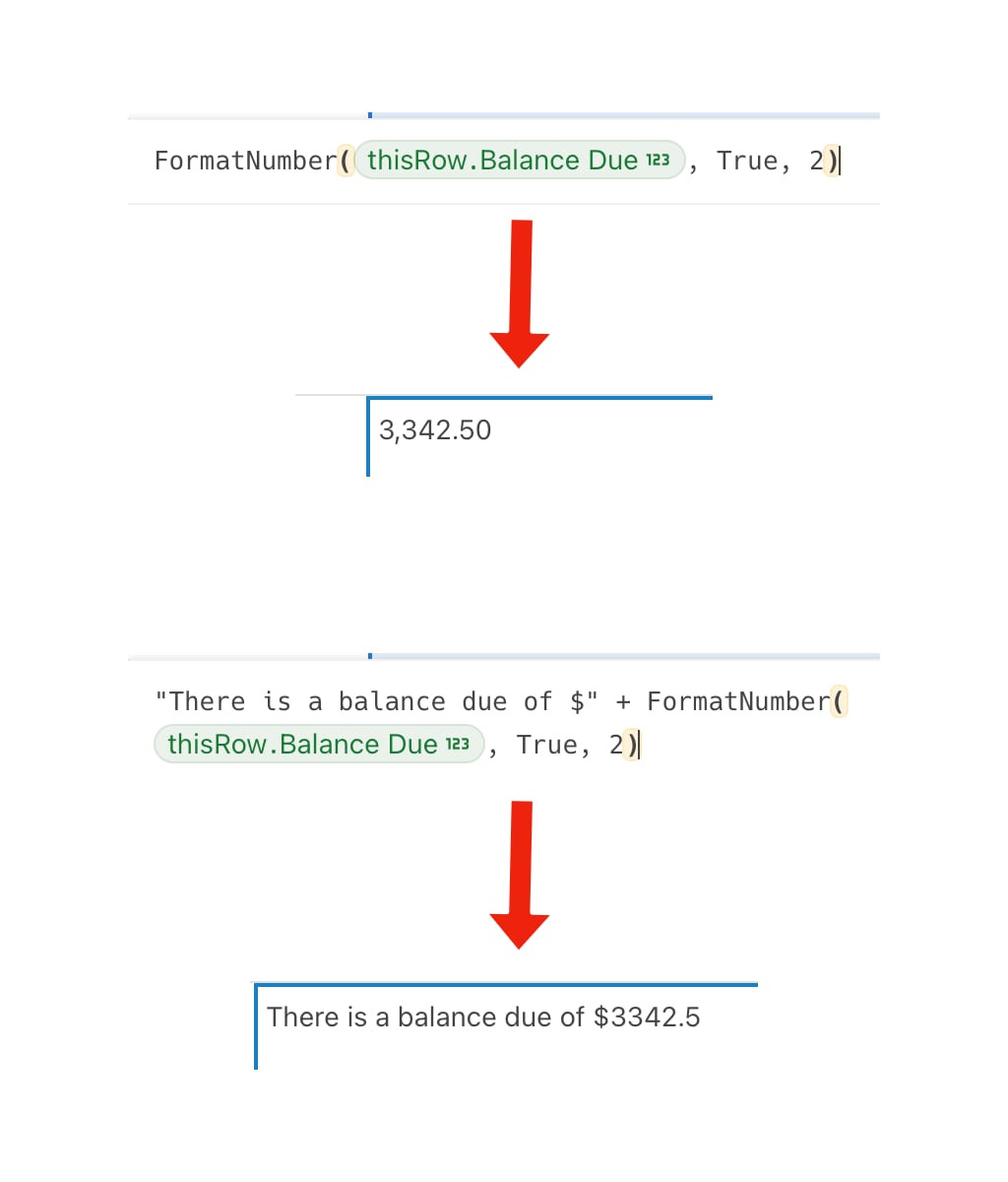 Concatenate("There is a balance due of $", FormatNumber(thisRow.[Balance Due], true, 2))