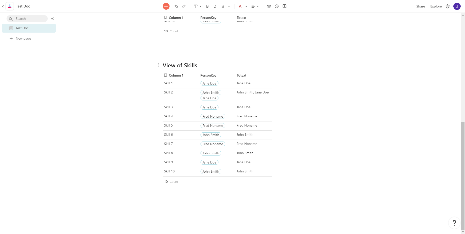 ‘Person’ table contains a list of people, and it contains a multiselect column for skills. This multiselect column is looking up the skills from a separate table.
