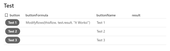 I wanted to see if I could make a button use a formula that’s not inside the button, but on another column of the same table row. That way I could have multiple buttons on the same column, each one of them doing something different.
