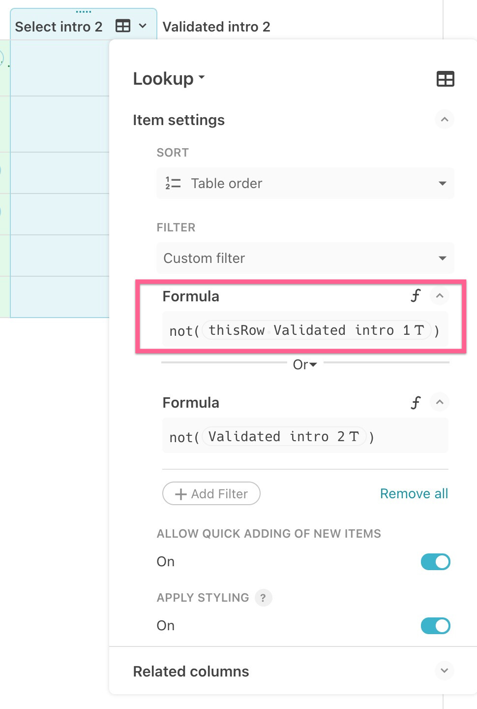 - In column [Select intro 1] I’ve included the following filter in item settings: not([Validated intro 1]). It does the job of avoiding matching the same person more than once in the same round. Works fine.