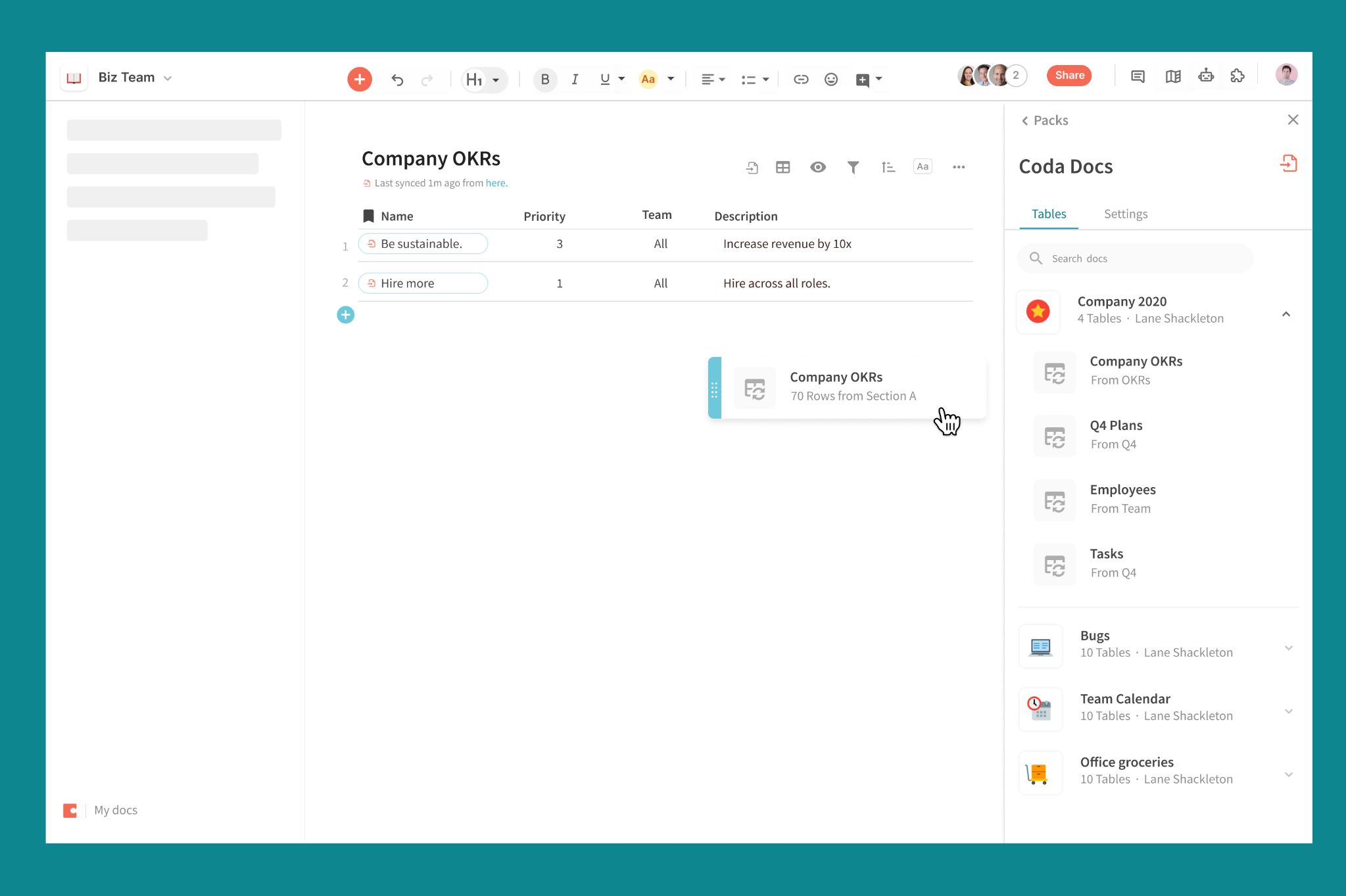 We built Packs to integrate Coda with the other apps your team uses. Interestingly, the number one Packs request wasn’t for another service, it was for another Coda doc. Cross-doc lets you pull data from one doc into another, so you can retain that ever-elusive single source of truth.