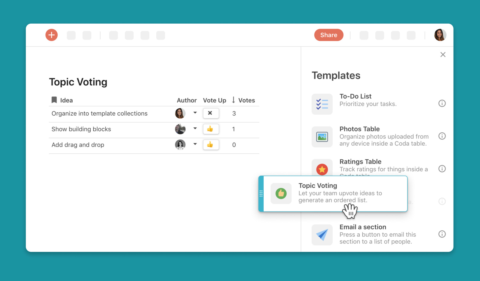 Even better, we turned our favorite building block compositions into drag-and-drop templates , and made them available right inside your doc. Now a teammate can add a topic voting table faster than you can say “show of hands.”