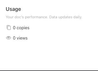 Your publishing analytics doc will include summary stats for all of your published docs, including sessions (total, as well as broken out by desktop, mobile and other devices), likes, copies, views and copy/view ratios. You’ll also be able to see a summary of the publishing settings for each, including discoverability, whether you’ve enabled the option to earn credit from your published docs, and more.