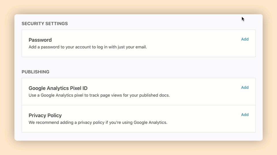 Tip: While we can’t provide specific legal guidance, we’ve been around the internet long enough to know that regulations related to cookies and user data vary by region, and are taken very seriously around the globe. For this reason, we recommend having a privacy policy in place if you are logging user session in Google Analytics. If you’ve already got a privacy policy for your business or site, you can provide a link just under the field where you add your Google Analytics profile ID so that it is easily accessible to your doc viewers. Want to know more? Visit this page for more details.