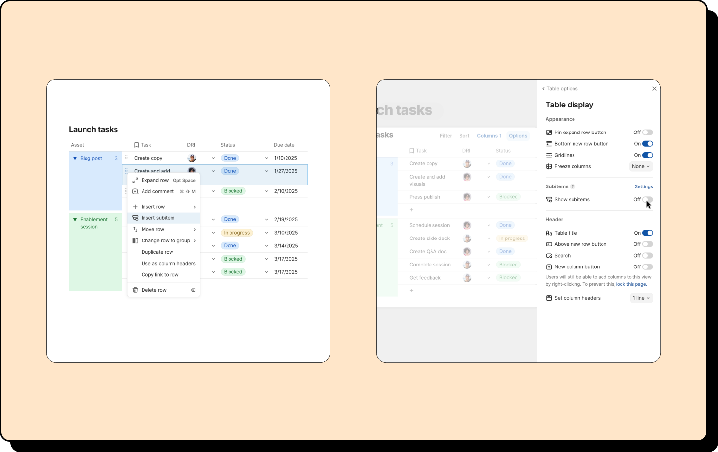 To turn on subitems, right-click (Windows) or command-click (Mac) on a row and select insert subitem. Alternatively, open the table display options and toggle show subitems. This will both turn on and display subitems.