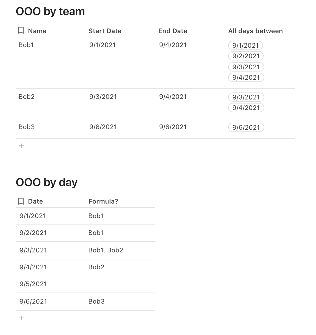 More specifically, I know how to write a lookup where (thattable, column1, =thisrow.X) returns all rows matching thisrow’s X. And I know how to write contains formulas. But I want to combine them, to return all rows where “All days between” contains “Date”. Or happy to consider another way to do a similar thing.