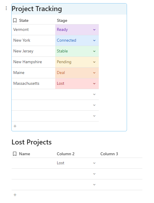 As you can see, I have two tables. I am trying to make a button that moves certain rows from Project Tracking to Lost Projects. As the name implies, I want to move the rows in the “Lost” stage under Project Tracking. So far I have been having trouble copying the exact rows from table to table, instead I keep getting rows that say “false”. My end goal is to then automate the button to be pressed weekly or so. Any help would be greatly appreciated, thanks!