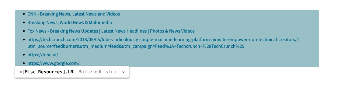 @Richard_Kaplan you can also use the .bulletedlist() formula on a Table filter in the canvas to display a bulleted list of results vs. a comma-delimited array! Would also use the Find() formula here to search the URL for a specific term (=lookup() is going to function more like a vlookup in excel, matching on the reference to a row or a column value vs. a search term.) Here’s what it might look like: =[Misc Resources].filter(Find("News", [URL])>0).bulletedlist()