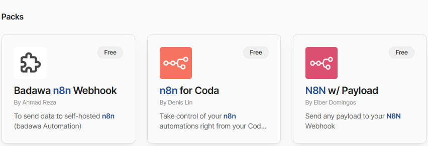 Just by searching for “n8n” in the Packs Gallery, you’ll find multiple options—all of which are free to use (at least the packs themselves)