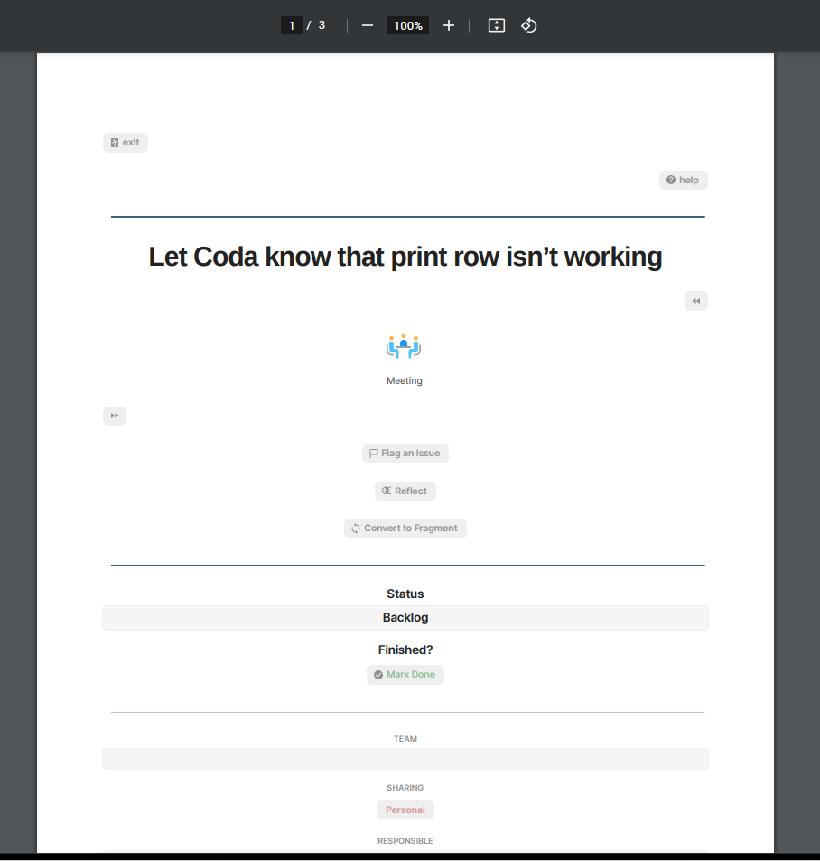 The 1st pic is a screenshot of a row modal from a Coda Doc. The 2nd is the exported PDF.