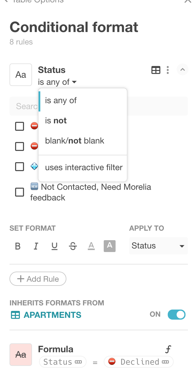 I’m trying to do add a “conditional formatting” rule to a table. The table was created in this template (https://coda.io/@rod/apartment-hunter), which I’ve copied and completely revised. (Thanks @Rod!).
