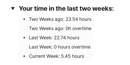 In my project, there’s a table named ‘Timesheet’ that includes typical fields you’d expect, such as Worker, Job, Start, End, Time Spent, etc. My goal was to devise a formula that, based on a selected worker, displays in bullet points the total hours worked in the past two weeks. The desired output resembles the image below: