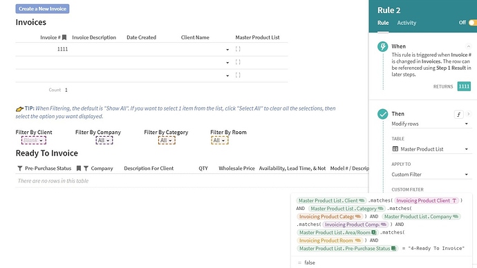 thisRow.Client.matches([Invoicing Product Client Filter]) AND thisRow.Category.matches([Invoicing Product Category Filter]) AND thisRow.Company.matches([Invoicing Product Company Filter]) AND thisRow.[Area/Room].matches([Invoicing Product Room Filter]) AND thisRow.[Pre-Purchase Status]=“4-Ready To Invoice”