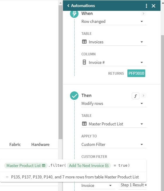 So then I added an automation using the same formula to add the new invoice number to all of those items. In the formula results display, it shows the correct selections. But when it runs, it adds the new invoice number to every item on the master product list, not just the 11 from the filter.