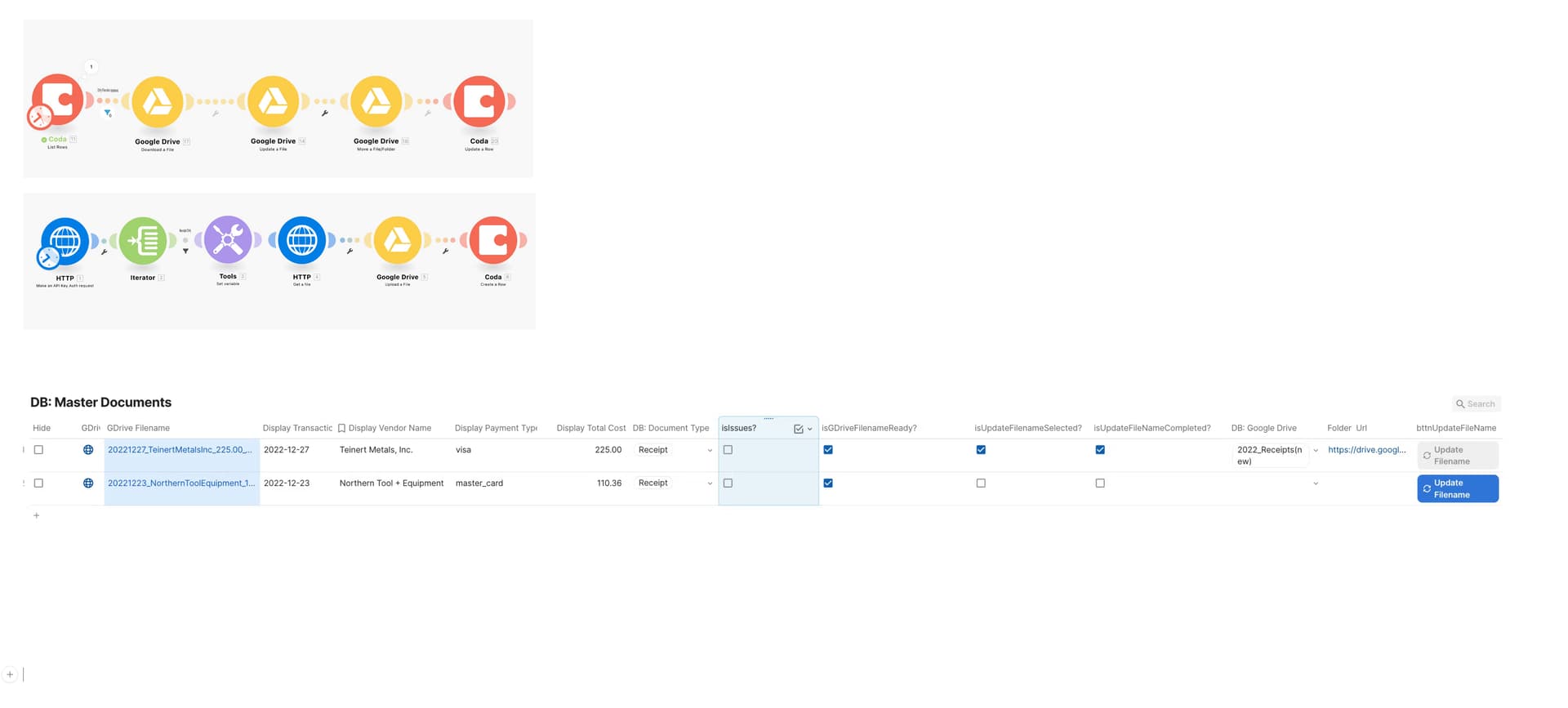 - Coda’s formulas allow me to generate a dynamic yet structured filename based on receipt info (see blue column) that will be used to update the temporary filename using Make. Make will also move the file to a permanent location based on the folder selected by the user under the Google Drive column.